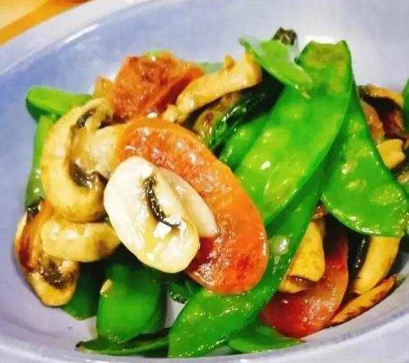 2、起鍋燒油,放蒜片爆香,下荷蘭豆口蘑,臘肉翻炒,下鹽少許,蠔油,生抽提鮮。翻炒均勻出鍋即可。
