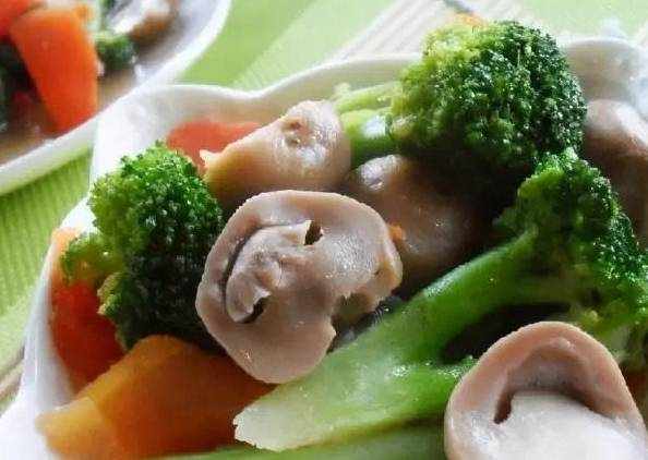 6.加入西蘭花塊,放鹽、雞粉、白糖、料酒,大火翻炒均勻,用水淀粉勾芡翻炒,出鍋裝盤。