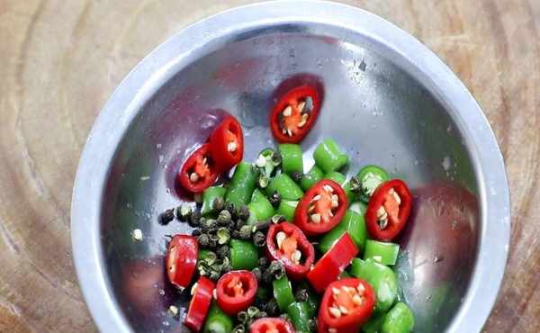 準備線椒幾根,切成小圈,紅椒一根,也切成小圈,青、紅椒能為菜品增色,再抓入一小把青花椒備用。