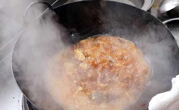 鍋內再燒油,油燒熱以後倒入薑、蒜爆出香味,撒入一小把花椒,一小把幹辣椒,開小火炒出香辣味,加入豆瓣醬10克,火鍋底料10克把醬料炒散炒出紅油,從鍋邊淋入一勺清水,倒入一罐啤酒,啤酒能夠去腥增鮮,加入生抽20克,開大火把湯汁燒開,把炸好的魚骨放入鍋中。