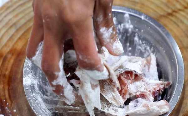 然後,我們把浸泡好的魚骨洗幹凈後撈出,抓入一小把幹淀粉,讓淀粉均勻裹在魚骨表面,這樣魚骨在炸制的時候不會濺油,口感更脆。