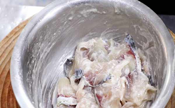 盆中加入食鹽1克,胡椒粉1克,料酒10克去腥,把所有料汁都打入魚片裡面,魚片抓黏之後,加入一個蛋清順著一個方向攪拌至上勁,蛋清能夠鎖住魚片中的水分口感更嫩滑,抓入一小把幹淀粉,再次拌勻醃制10分鐘。