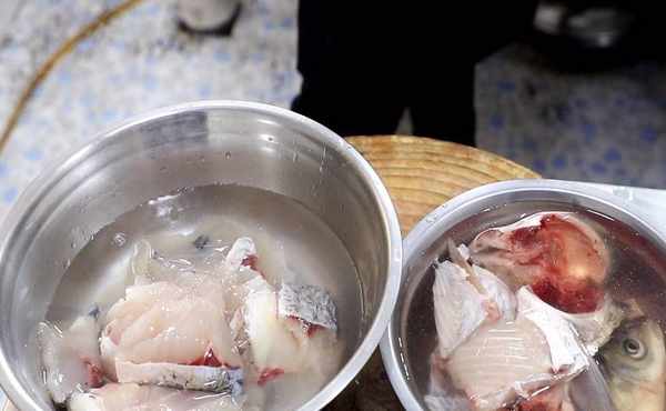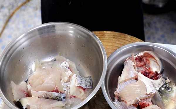 全部處理好以後,我們把魚片、魚骨分別盛放在盆中加入適量的清水,把魚骨浸泡10分鐘更容易去除血水,把魚片抓洗幹凈後撈出擠幹水分。