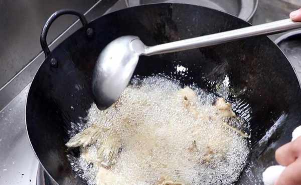 鍋內燒油,油溫五成熱,油面輕微冒煙時,把魚骨一塊一塊放入鍋中防止粘連,魚骨下鍋以後不要翻動,輕輕晃動鍋防止魚塊粘在鍋底,魚塊定型以後把粘在一起的用勺子打散,保持小火炸3分鐘左右,魚骨表面呈金黃色倒出控油。