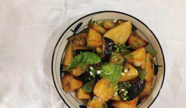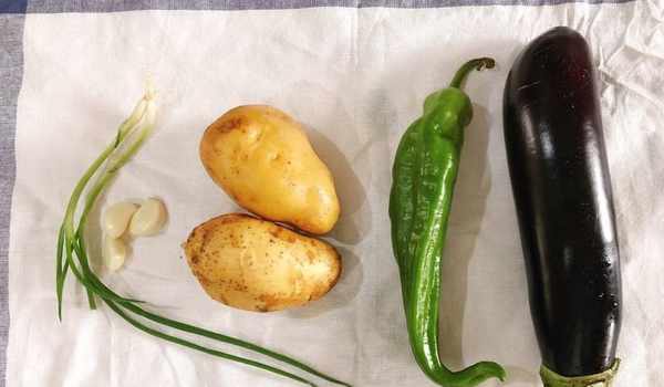 【烹飪食材】:土豆兩個、茄子一個、青椒一個、小蔥適量、大蒜適量、白糖適量、生抽3勺、米醋適量、蠔油一勺