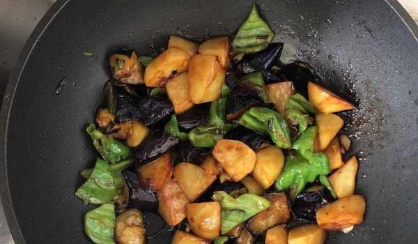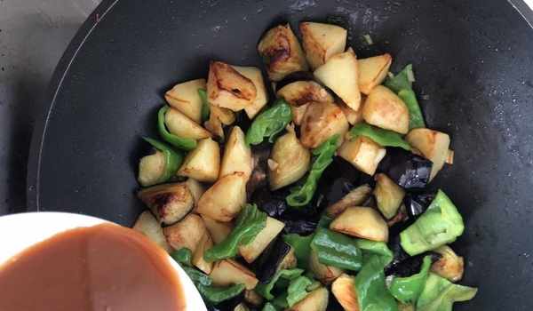 9、炸好的土豆青椒茄子一起倒入翻炒,然後加入調制好的料汁。