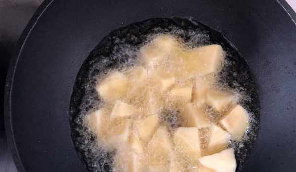 4、鍋中加入適量的食用油燒熱,大約油溫達到6成的時候將土豆塊放入油鍋中炸制。