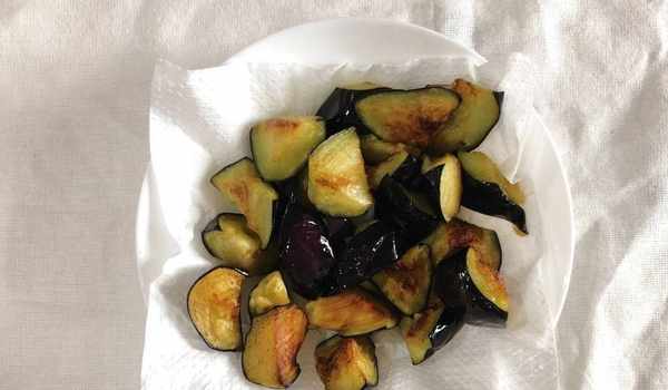 7、茄子也放入油鍋中,炸制變軟瞭之後撈出來,用廚房紙吸幹油脂。