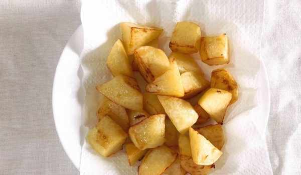 5、土豆塊炸制金黃就可以瞭,撈出來用廚房紙吸油備用。