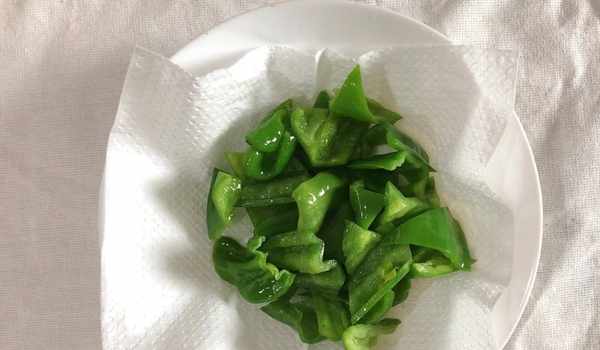 6、青椒也放入油鍋中炸制一下,青椒炸制的時間不用太長,看見有點變軟瞭就可以瞭,同樣撈出來控油。