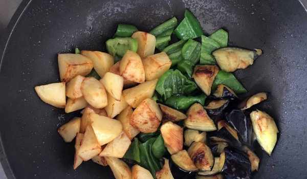 2、茄子土豆和青椒炸制的時間要控制好,土豆和茄子的時間嗎差不多,表面有點焦黃瞭就可以盛出來瞭。