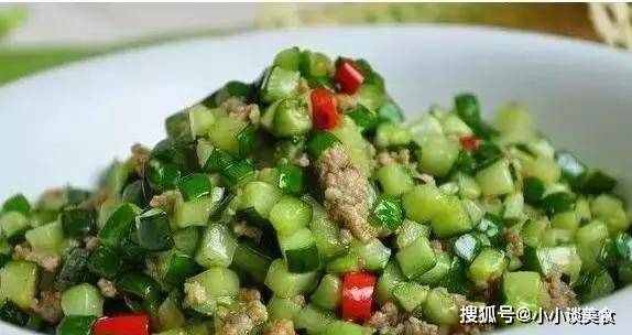 1、黃瓜洗凈,切成1厘米見方的小方塊,用少許鹽醃10分鐘,擠幹水分;鉛豬肉切成同樣大小的方塊備用。