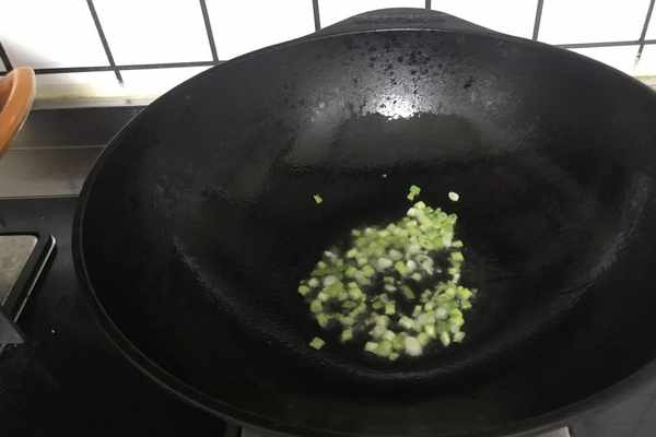5、炒鍋燒開,倒入適量食用油,直接冷油放入切碎的蔥白末,進行翻炒均勻,如圖所示。