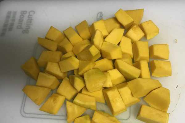 2、將南瓜去皮去瓤,再切成小塊,如圖所示。