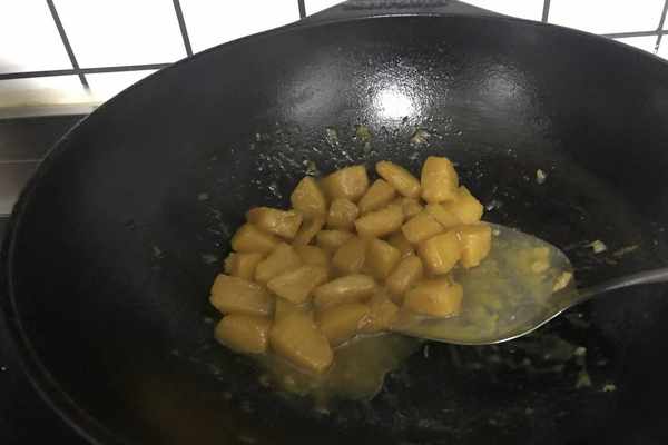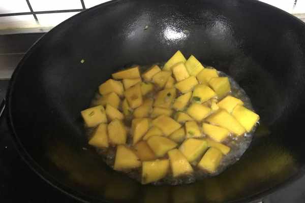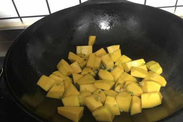 6、放入切好的南瓜塊,繼續進行翻炒均勻,如圖所示。