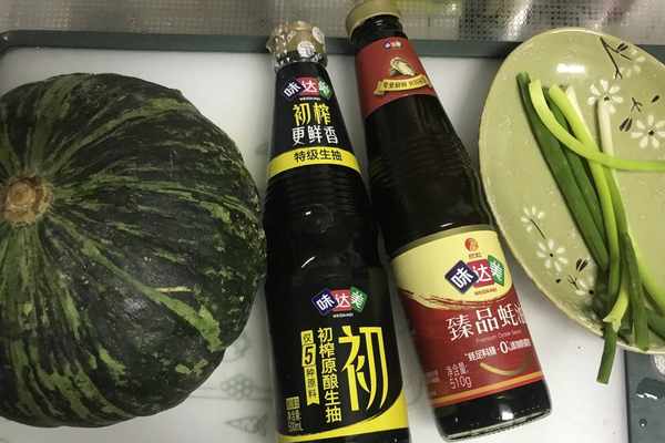 食材用料:板栗南瓜半個、小蔥2棵、生抽1勺、蠔油1勺、糖1小勺、玉米淀粉1小勺、水適量