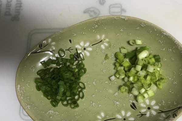 3、準備好的小蔥分別將蔥白和蔥葉部分分開切碎待用,如圖所示。