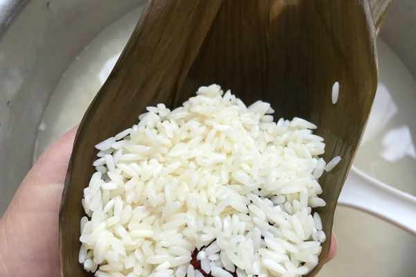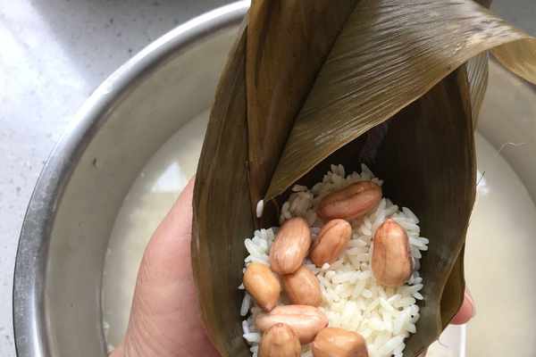 步驟五:全部準備好瞭,開始包吧!先把浸泡好的粽子葉清洗幹凈,取一片兩手對折一下,自然形成一個漏鬥的形狀,先放一個大棗,接著放入一半的糯米,然後放上幾粒花生米。