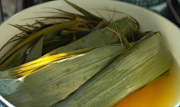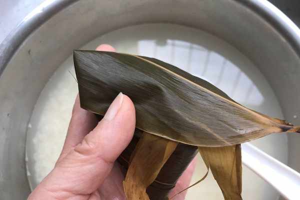 步驟二:買回來的粽子葉放進開水鍋裡煮15分鐘後關火。一是為瞭消菌殺毒,二是為瞭用起來順手,粽子葉經過高溫煮泡之後,會變得柔軟許多,用起來更得心應手。