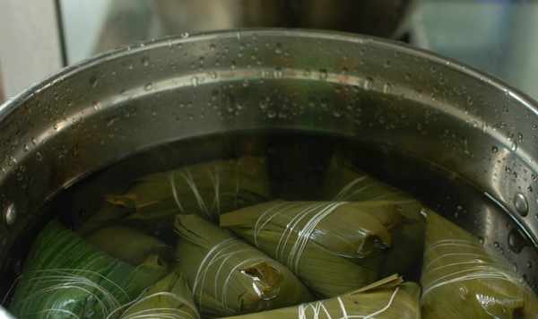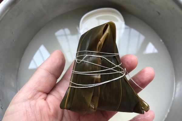粽子煮好之後,關火,不要急著拿出來,在原汁中浸泡七八個小時才會更好吃。如果是晚上煮,可以浸泡到第二天早上。經過浸泡的粽子,更軟更香更糯,粽葉的香、糯米的香,還有紅棗的香相互融合,粽子更好吃。