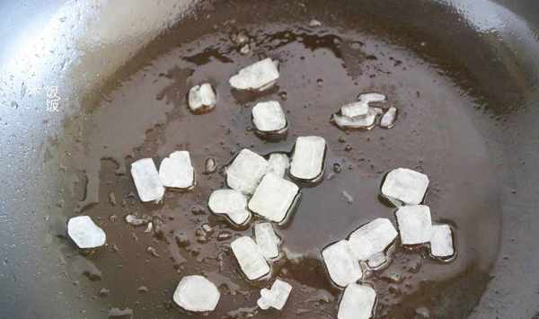 4,熱鍋倒入一點點油,放入適量冰糖,先中火將冰糖炒化,再轉小火繼續不停地炒。