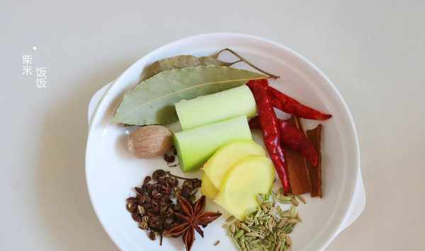 3,再準備一些香料。八角一個、桂皮一小段,這兩樣多瞭會有苦味,盡量少放。再來一個肉蔻增香、花椒少許、小茴香少許、薑片、蔥段、幹辣椒。