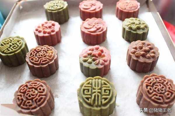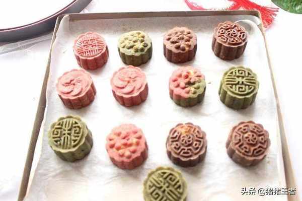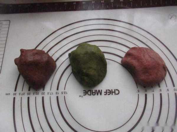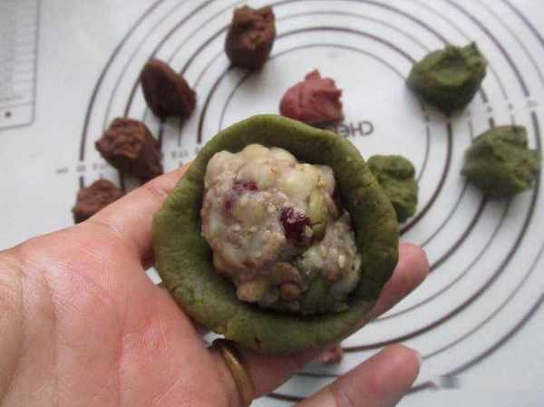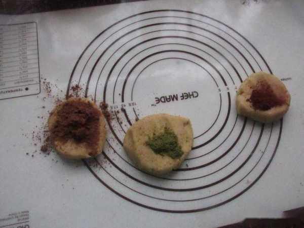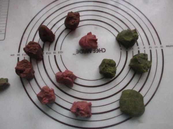 白豆沙200克,黃油14克,麵粉30克,五仁餡適量。抹茶粉2克,紅麴米粉2克,可哥粉2克。