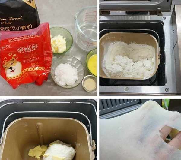 3.10分鐘後,面團成型且能拉出厚膜時,將黃油塊入面包桶中,完成剩下的10分鐘,再追加一個揉面程序15分鐘左右;