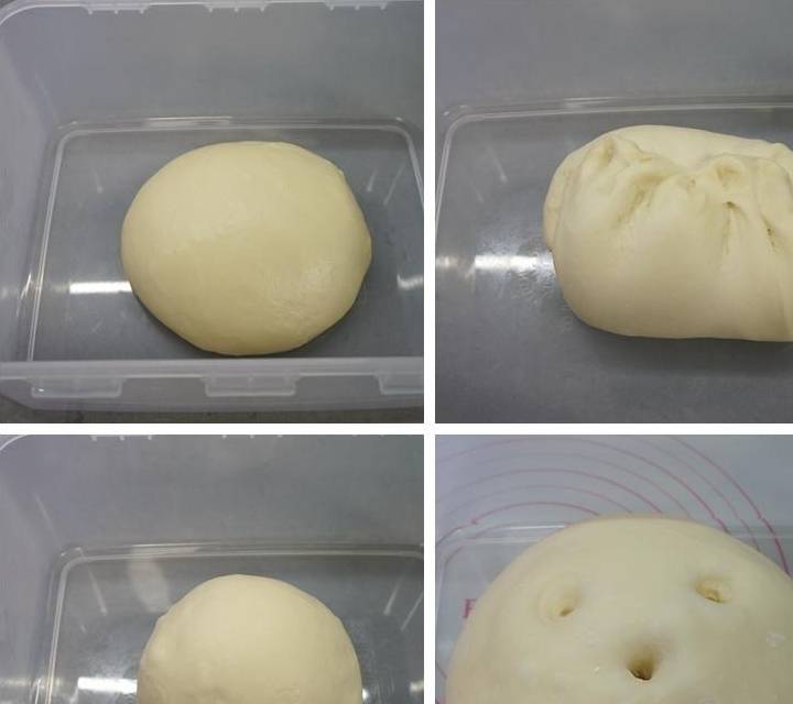 7.再拿起來,光滑的一面朝上,將面團收圓放在保鮮盒中發酵至2-2.5倍大小;