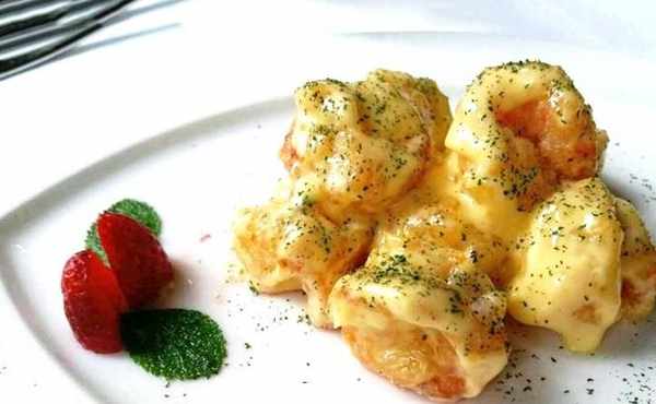 蝦球200克、沙拉醬75克、檸檬1隻、蕃茜15克、草莓1個、薄荷葉、生粉、鹽、雞粉