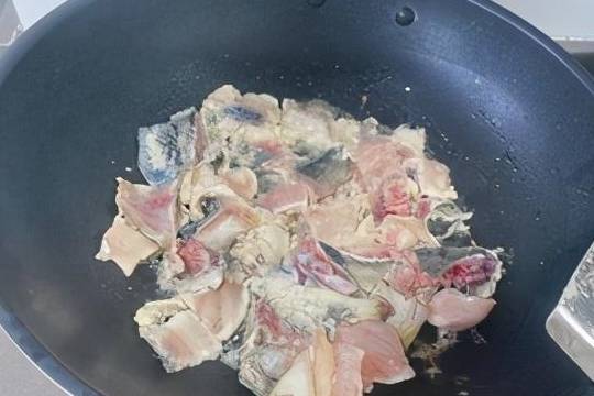 起鍋燒油加少許鹽防止爆炸放入魚片翻炒