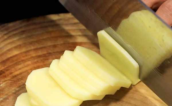 準備洗凈的土豆兩個,把外皮削幹凈,切掉邊緣不整齊的地方,方便做造型,如下圖所示中那樣,切成連刀片,切第一刀不要切斷,切第二刀斷開,盡量切得薄一些,更容易炸熟。