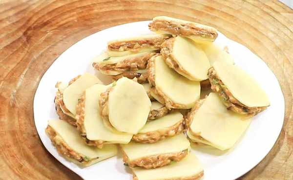 切好之後我們開始制作土豆夾,在土豆片中塞入適量肉餡,把邊緣塗抹平整,讓土豆夾緊緊地裹住肉餡即可,把所有的土豆夾都這樣做好瞭。
