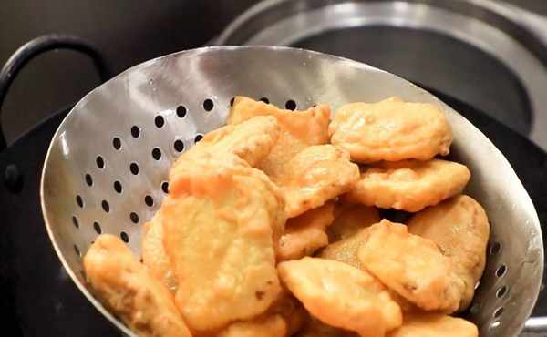 保持小火慢炸,輕輕地推動,讓其均勻受熱,待土豆夾定型、表面呈微黃色時撈出。