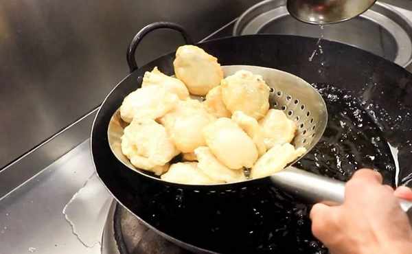 鍋內燒油,油溫升至5成熱,油面輕微冒煙時,把土豆夾均勻裹上面糊,放入油鍋中,土豆表層的面糊,遇熱後會迅速飄起,起鍋或者開小火,繼續下土豆夾,這樣能保證前後下入的土豆夾色澤和生熟一致。