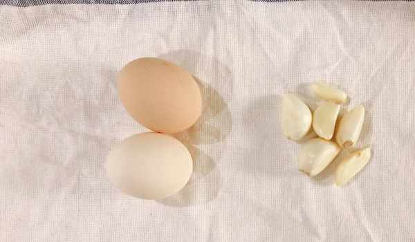 1、準備好要用的食材,兩個雞蛋和6瓣大蒜,這道菜的食材非常的簡單。