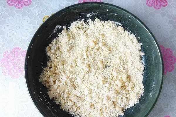 1、面粉準備好,放入泡打粉、小蘇打和鹽混合均勻,然後倒入玉米油簡單拌一拌後用手搓勻,拌成粗顆粒狀的樣子。