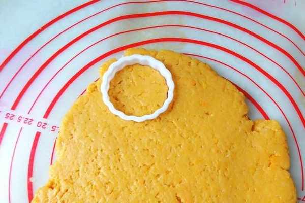 5、揉好的面粉無需餳發等,直接就可以搟成1厘米厚的大片,用一個餅幹模具來分割,如果沒有,直接切方塊也是一樣的。