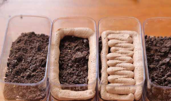 13、蛋糕盒子裡先鋪上一層蛋糕胚,再撒上適量的奧利奧碎,再擠上巧克力奶油;