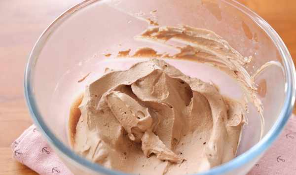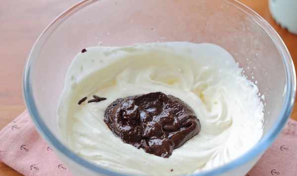11、淡奶油加入白糖、擠入幾滴檸檬汁打至有紋路的狀態,再把晾涼的巧克力醬加進去,繼續打均勻;