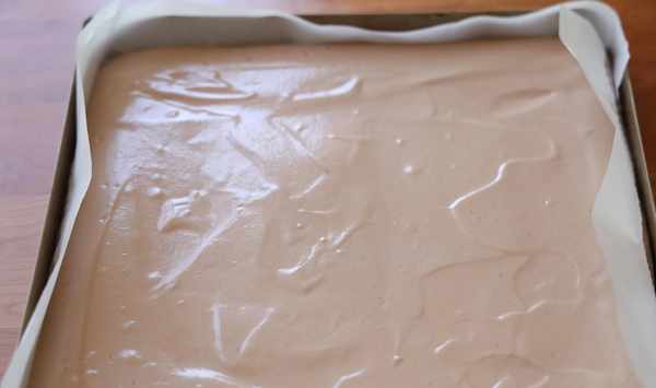 6、拌好的蛋糕糊倒在28的方盤裡,把表面攤平整;