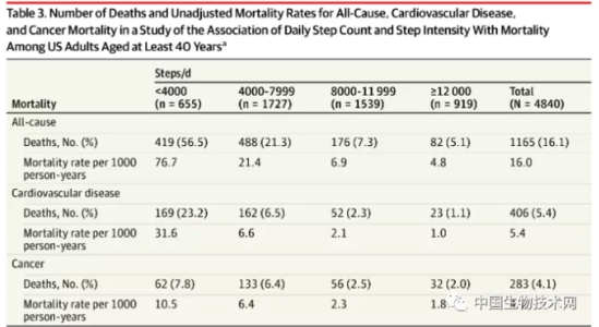 參與者平均每天走9124步。截止到2015年12月,在平均10.1年的隨訪中,參與者中共有1165人死亡,其中死於心血管疾病的有406人,死於癌症的有283人。分析結果顯示,每日步數和全因死亡率密切相關: