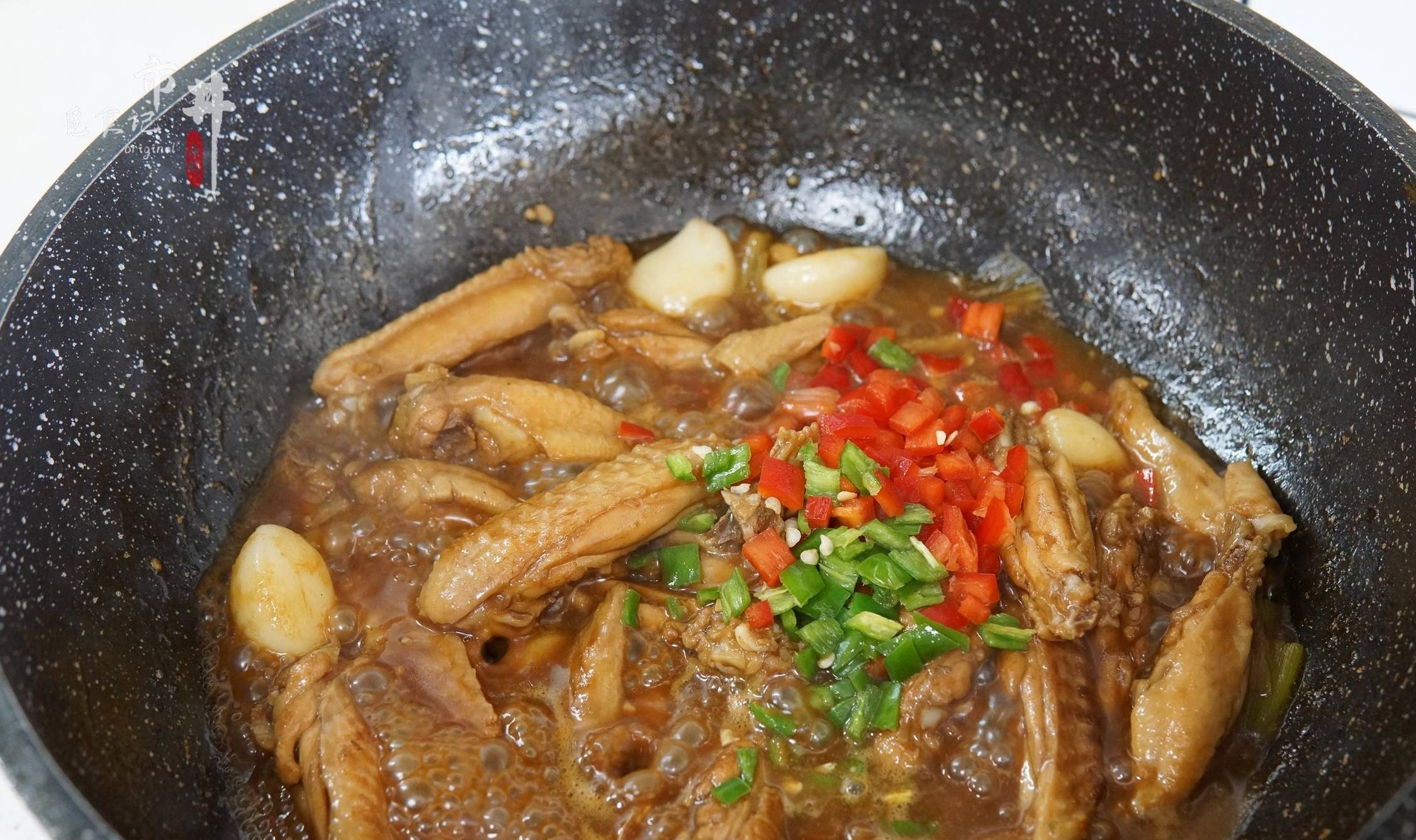 6、倒入切好的青紅椒丁,根據味道再加入適量鹽和雞精調味,最後開大火收汁即可,一盤解饞又下飯的蒜香雞翅就做好瞭。