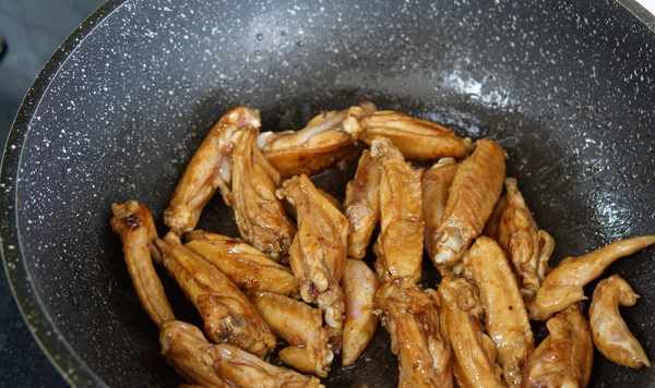 3、鍋中加入寬油,油熱倒入醃制好的雞翅,中小火煎至兩面金黃,撈出備用。