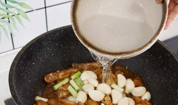 5、倒入剝好皮的大蒜,加入適量的清水,轉中火燜煮15分鐘左右。