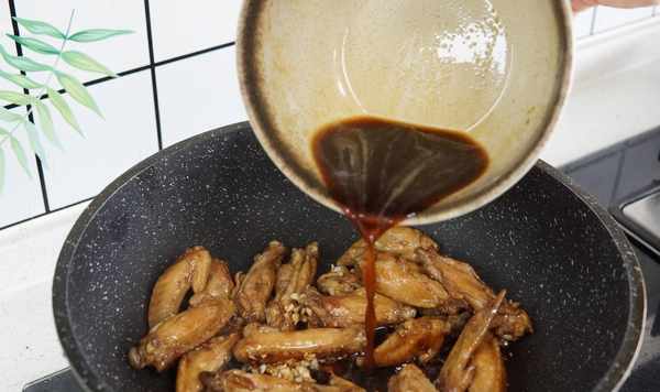 4、鍋中餘油加入蒜末炒香,倒入煎好的雞翅,倒入醃雞翅的料汁,翻炒均勻。