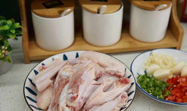 1、雞翅洗凈,用剪刀順著雞翅中間剪開,青紅椒洗凈切丁,大蒜剝皮一部分切碎另一部分備用。