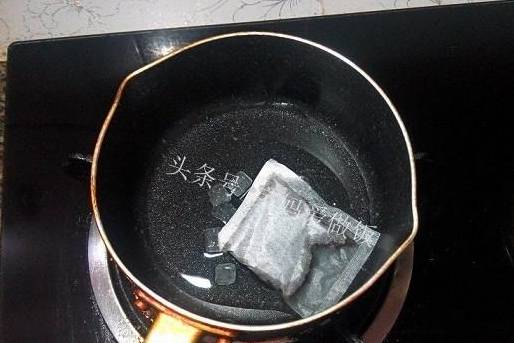 小奶鍋(圖中為14厘米)放入剛剛能沒過鍋底的清水,小火燒開,放冰糖和紅茶包,煮至冰糖融化。