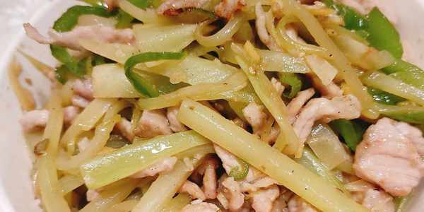 第一道菜,萵筍青椒炒肉。萵筍和青椒的清香,配上裡脊肉的鮮嫩,太下飯瞭,不過最後是萵筍和青椒比肉先吃完。