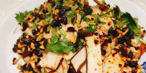 第四道,涼拌豆幹。將豆幹先焯水,放涼後切成薄片。然後準備調料,分別有老幹媽豆豉,生抽,蠔油,醋,薑末蒜末,花椒油,少許食用鹽,香菜,攪拌均勻,淋在豆幹上,一道香辣入味的涼拌豆幹就做好瞭。